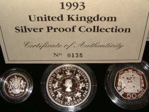 | 1993 Silver Proof Collection. £5 Crown 40th anniversary Queen Elizabeth II Coronation, £1 Royal Coat Arms, 50 Pence Britain's Presidency Council of Ministers & Single European Market 20th anniversary of Britain's entry into the EEC. In Royal Mint Box & COA |
