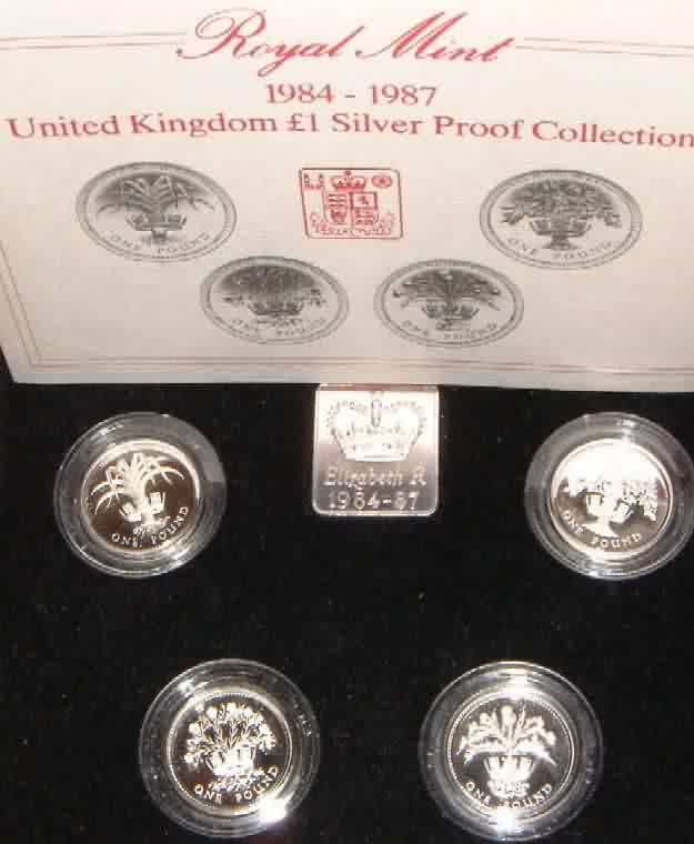 | Silver Proof Pound Collection 1984-87. Four GB 1 Pound coins 1984 Scottish Thistle for Scotland, 1985 Welsh Leek for Wales, 1986 Flax plant for Northern Ireland, 1987 English Oak Tree for England plus Royal Mint medal,In red leatherette box of issue with COA. |