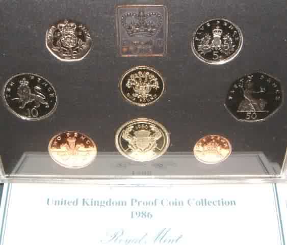 | 1986 Proof Set (Currency) £2 Commonwealth Games in Scotland,£1 Flax Plant Northern Ireland,50p,20p,10p,5p,2p,1p. Blue case of issue & COA |