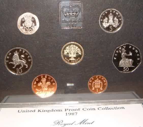 | 1987 Proof Set. (Currency) £1 English Oak Tree,50p,20p,10p,5p,2p,1p.Deluxe issue Red leatherette case & COA |