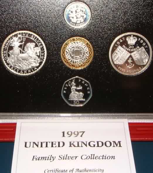 | 1997 Family Silver Proof Set.£5 40th Wedding Anniversary of Queen Elizabeth II,£2 Britannia (1oz pure silver) £2, Bi-Metal,£1 Three Lions for England,50p.In Red leatherette case of issue with COA. Very minor toning |