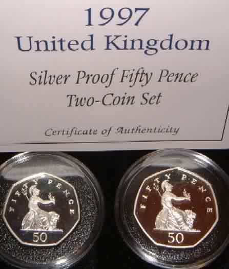 | 1997 silver | Pair Last year of issue large size 50p & 1st Year of issue new smaller size 50p. In Royal Mint Box & COA |